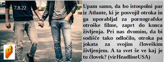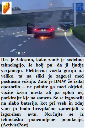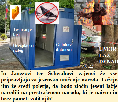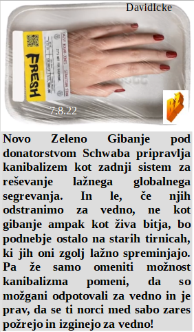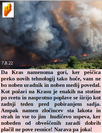Schwabov Zeleni sistem je jesti sveže človeško meso. Pred skokom na vlado so obljubljali boj z draginjo. Ve se, da so požari namerni, škoda, ker zato trpi Kras. Je že skoraj vse pripravljeno za jesenski zakol naroda z lažjo! Lepo je voziti električne avtomobile in se veseliti ogledovanja požarov. Istospolni par posvojil otroka za zlorabo v porno filmih. Upajmo, da jim uspe in res ne bodo plačali elektro računov po 1.oktobru!