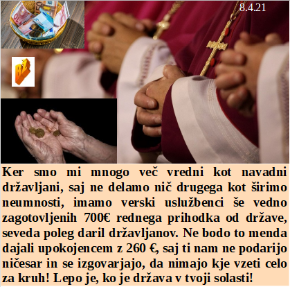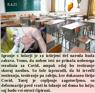 Vam je morda jasno koga ste v zadnjih 30 letih vi volili? Vsi zaporniški ukrepi so skrbno dogovorjeni med Vlado in svetovalno skupino. Nam je večkrat povedala šefica, da ni možnosti zavrnitve povsem neustreznega cepiva. Določena skupina garačev, povsem ločenih od države, ki nič ne dela, ima mesečni državni prispevek za mnoge v višini dveh pokojnin. In zlagani testi morda celo prinesejo nekaj učencev v šole!