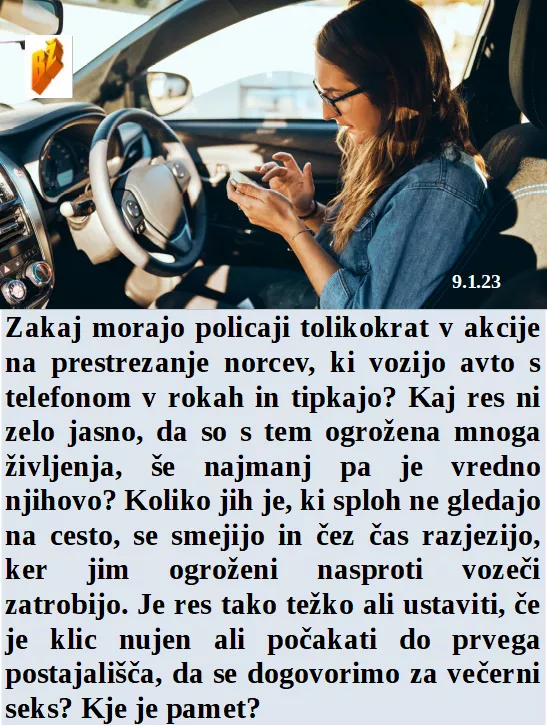 Zakaj se ljudje tako razburjajo zaradi nas, ki vozimo s pametnim telefonom in se igramo med vožnjo? Seveda razumemo doktorje, da bodo stavkali, samo 48 jih je med najbogatejšimi. Je nova predsednica očitno zaljubljena v laži in nasilje? Je Slovenija zabeležila manj porodov in več migrantov, torej prebivalstva bo več.
