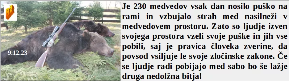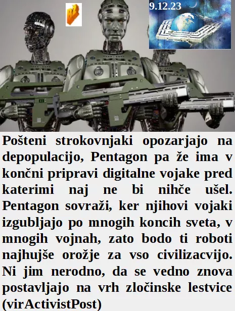 Nas čaka popolnejša depopulacija z robotskimi vojaki iz Pentagona? So medvedi živeli v naravnem okolju in jih je vseh 230 pobila še hujša zverina človek. Je prva Ukrajinska dama kar Slovenske medije prosila za vojaško pomoč. Celo EU zdravstveni delavci so bili zgroženi, saj Izrael ni samo pobijal nedolžnih!