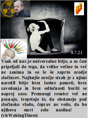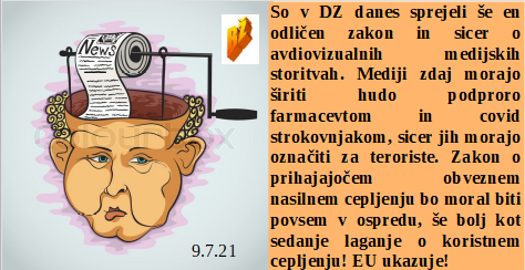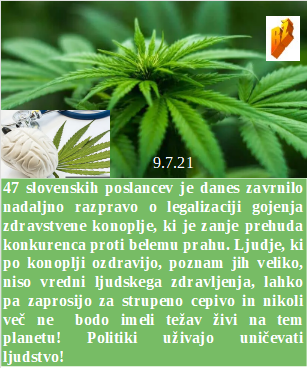 Groziti drugemu s smrtjo je enako kot groziti s cepljenjem. Večina dovoli biti zaprta in služiti zločinskim oblastem. Le zakaj bi poslanci odobrili gojenje konoplje, ko pa ta zdravi hudičevo zares? Mediji po novem zakonu lahko služijo le še farmacevtom in lažem politike. Se človek hvali pa zagovarja cepljenje za prezgodnjo smrt. Čez lužo pa celo zahtevajo zapor za vse, ki pomagajo revežem!