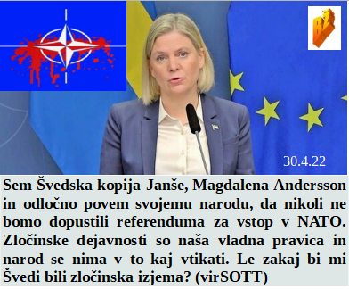 Samo zaradi obveznega zapiranja in nošenja mask imajo množice otrok hude psihične motnje. Ne Švedi, zgolj Anderssonova bodo odločali o vstopu v krvavi NATO! Vsak vladar ima svoje gospodarja, ki ga povsem uboga. Katera ura Guterres ti najbolj ustreza, da narediva eksplozijo ali zažgeva palačo? Mediji so danes le za širjenje laži in preprečevanje resnice!