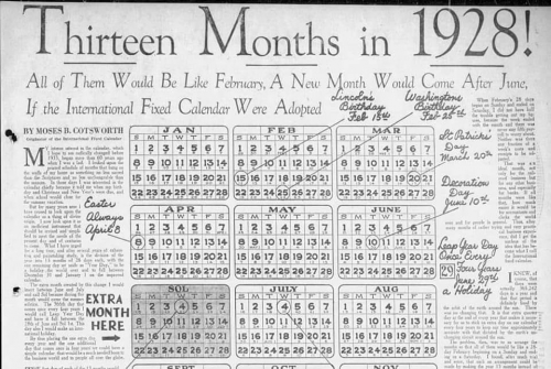 Potem ko je Augustus Comte leta 1849 izumil pozitivistični koledar in ideja ni bila široko sprejeta, je zamisel nekako umrla za 70-nekaj let, dokler je britanski računovodja po imenu Moses Cotsworth ni vrnil. Poleg tega, da ima eno najbolj britansko zvenečih imen vseh časov, »Moses Cotsworth, britanski računovodja«, je Cotsworth med delom za železniško podjetje razvil mednarodni fiksni koledar. Kot veste, so železnice močno odvisne od voznih redov in urnikov. In misel, da mesečnih obračunov na železnici ni mogoče enakomerno in pošteno primerjati med seboj, ga je res motila. Naj vam dam primer, ki je bil predstavljen v The Outlooku, priljubljeni reviji v New Yorku v dvajsetih letih prejšnjega stoletja: