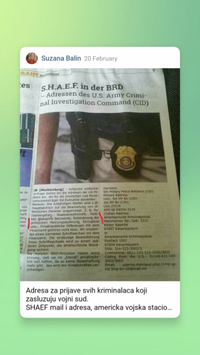 Za sve sto ste dozivjeli, qko su doktori nacinili ubistvo nad nekim vasim dragim, sve sto zelite prijaviti, pisite na SHAEF . Oni ce to istraziti, ne trebate odvjetnike, pisite, prijavljujte. Trump je dao executive order Shaef za Evropu i niko ga ne moze ponistiti, trazimo od njih pomoc. Zato i jesu tu da nam pomazu protiv ovih satanista.