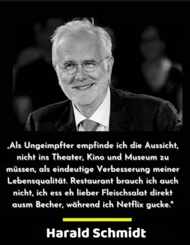 Kot necepljen imam možnost, da mi ne bo treba hoditi v gledališče, kino in muzej, in to dojemam kot izboljšanje kakovosti mojega življenja. Ne potrebujem niti restavracije, med gledanjem Netflixa bi jem mesno solato naravnost iz sklede.