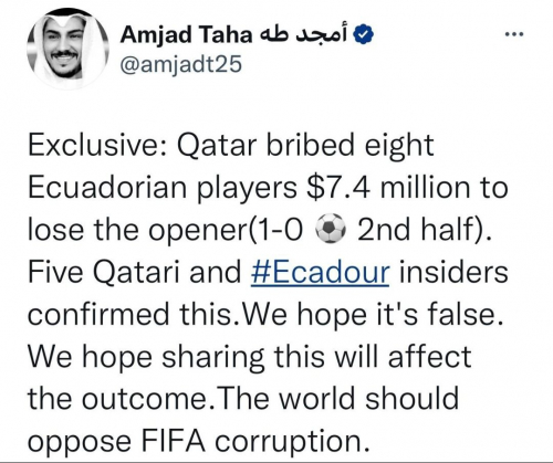 Katar je podkupil osem ekvadorskih igralcev za 7,4 milijona dolarjev, da bi izgubili tekmo (0-1, gol v 2. polčasu). Pet insajderjev iz Katarja in Ekvadorja je to potrdilo: V nedeljo se s tekmo Katar-Ekvador začne svetovno prvenstvo. Od obtožb o "teptanju pravic" LGBT oseb in delavcev, ki so umrli na gradbišču, je zahodni tisk prešel na zgodbe o tem, kako je "Katar pokupil vse". Amjad Taha, novinar in regionalni vodja britanskega Centra za bližnjevzhodne študije, je vrinil podatke o podkupovanju nogometašev.