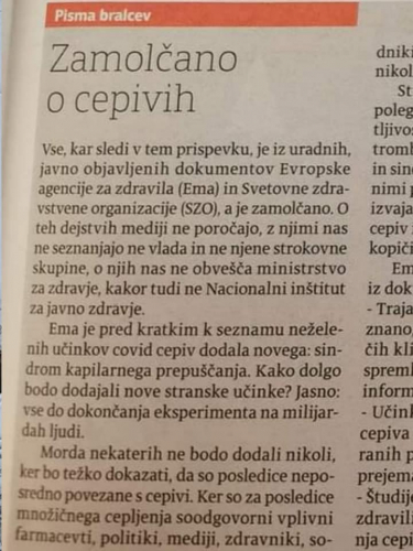 Na še eno pomembno stvar je treba opozoriti. Jasno in glasno. Proizvajalci cepiva in njihovi distributerji (državni regulatorni organi, ministrstvo za zdravje, nacionalni zavod za zdravje, zdravniška zbornica, zdravniki) vztrajno uporabljajo zavajajočo besedno zvezo, da so cepiva »učinkovita in varna«, podzavest preprostih ljudi to prevaja v »koristna in neškodljiva«. Zakaj zdravniki in vsi drugi ne uporabljajo besed »koristna in neškodljiva«? Za cepiva in vsa druga zdravila? Preprosto zato, ker je koristnost cepiv nedokazana in ker cepiva vsebujejo snovi, ki so škodljive. Pustimo v tem zapisu ob strani številne znanstvene dokaze, da so cepiva nekoristna in škodljiva in se vprašajmo, s kakšnimi dokazi proizvajalci cepiv in njihovi distributerji dokazujejo njihovo koristnost in neškodljivost. Ker teh dokazov nimajo, uporabljajo besede s popolnoma nedoločljivim pomenom: učinkovita in varna. Če se hočemo napiti, je alkohol v zmernih količinah zelo učinkovit in varen, ni pa koristen in je škodljiv.