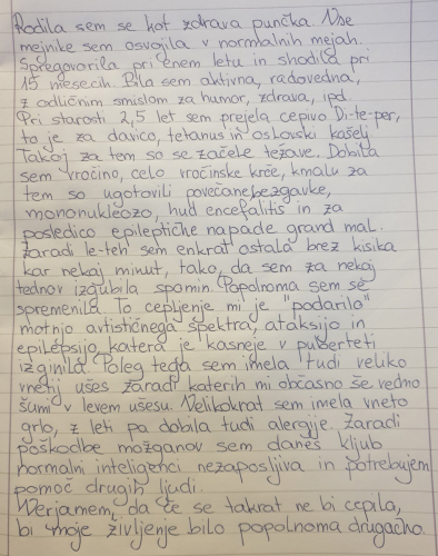 "Rodila sem se kot zdrava punčka. Vse mejnike sem osvojila v normalnih mejah. Spregovorila pri enem letu in shodila pri 15 mesecih. Bila sem aktivna, radovedna, z odličnim smislom za humor, zdrava, ipd. Pri starosti 2,5 let sem prejela cepivo Di-ter-per, to je za davico, tetanus in oslovski kašelj. Takoj za tem so se začele težave. Dobila sem vročino, celo vročinske krče, kmalu za tem so ugotovili povečane bezgavke, mononukleozo, hud encefalitis in za posledico epileptične napade grand mal. Zaradi le-teh sem enkrat ostala brez kisika kar nekaj minut, tako da sem za nekaj tednov izgubila spomin. Popolnoma sem se spremenila. To cepljenje mi je “podarilo” motnjo avtističnega spektra, ataksijo in epilepsijo, katera je kasneje v puberteti izginila. Poleg tega sem imela tudi veliko vnetij ušes, zaradi katerih mi občasno še vedno šumi v levem ušesu. Velikokrat sem imela vneto grlo, z leti pa dobila tudi alergije. Zaradi poškodbe možganov, sem danes, kljub normalni inteligenci nezaposljiva in potrebujem pomoč drugih ljudi.