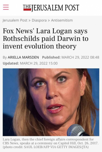 Lara Logan s Fox News je povedala, da so Rotschildi plačali Darwinu, da je "izumil" teorijo evolucije.