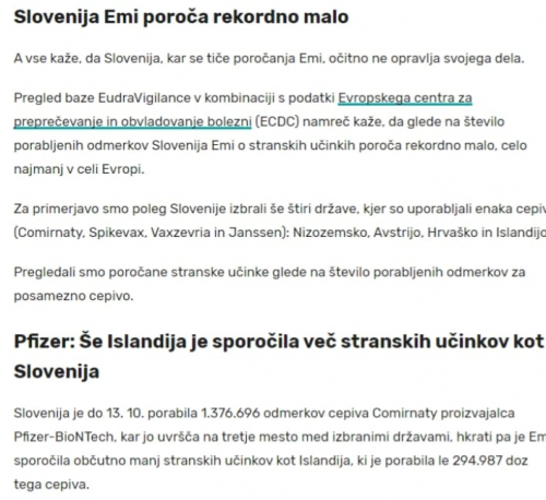 Pregled baze EudraVigilance v kombinaciji s podatki Evropskega centra za preprečevanje in obvladovanje bolezni (ECDC) namreč kaže, da glede na število porabljenih odmerkov Slovenija Emi o stranskih učinkih poroča rekordno malo, celo najmanj v celi Evropi.