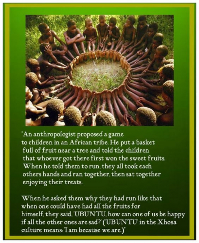Nek antropolog je otrokom afriškega plemena predlagal igro: Pod drevo je postavil košaro polno sadja in rekel otrokom, da sadje dobi tisti, ki prvi priteče h košari. Ko je dal znak za začetek, so se otroci prijeli za roke in skupaj stekli h košari, sedli okoli nje in skupaj uživali sadje. Na vprašanje kako to, da se ni nihče potrudil osvojiti košare samo zase so odgovorili ''Ubuntu''. Kako naj bo eden srečen, če so vsi ostali žalostni?