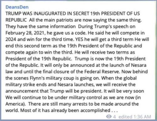 Vsi glavni domoljubi zdaj govorijo isto. Imajo enake informacije, saj nam je Trump, v svojem govoru, 28. februarja 2021, dal kodo. Dejal je, da se bo potegoval leta 2024 in zmagal še tretjič. DA, dobil bo tretji mandat. Drugi mandat bo zaključil kot 19. predsednik republike in se nato znova potegoval za tretjega. Za predsednika 19. republike bo dobil dva mandata. Trump je zdaj 19. predsednik republike. To bo objavljeno šele ob uvedbi zakona Nesara in ob dokončnem zaprtju Zvezne rezerve. Zdaj v zakulisju poteka Flynnov vojaški udar. Ko se bo končal svetovni vojaški udar in, ko se bo Nesara začela, bomo prejeli obvestilo, da bo Trump postal predsednik. To se bo zgodilo zelo kmalu. Še naprej bomo pod vojaškim nadzorom, tako kot smo že sedaj (v Ameriki). Po vsem svetu je treba izpeljati še veliko aretacij. Večina tega dela je že opravljena ...