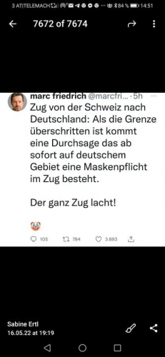Na vlaku iz smeri Švice v Nemčijo: ko prečka mejo, se iz zvočnika zasliši obvestilo, da je od zdaj naprej v vlakih na nemškem teritoriju obvezno nošenje maske.