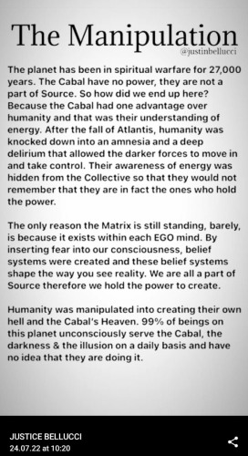 53. Njihovi voditelji se bodo imenovali "premikalci" in jih bodo učili verjeti v lažne obrede prehoda v višja kraljestva in kraljestva. Člani te skupine bodo mislili, da so eno z nami, nikoli pa ne bodo vedeli prave resnice. Nikoli ne smejo izvedeti za to resnico, ker se bodo obrnili proti nam.