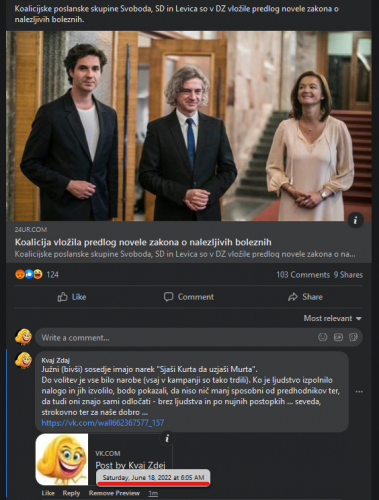 Primer 1. - Na nekem fb računu je 18.06.2022 ob 06:05 objavljen komentar na en prispevek (slika 1). Po objavi je komentar viden (slika 2), komentar pred tem je obkrožen (zaradi reference) in takrat je bil prispevek objavljen že 10 ur.