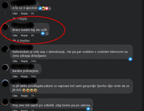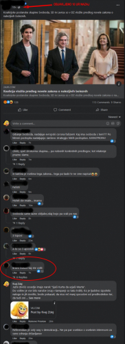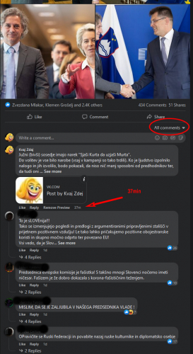 Primer 2. - Na nekem fb računu je 18.06.2022 ob 05:58 objavljen komentar na en prispevek (slika 4). Po 37 minutah je bil komentar viden (slika 5), ampak samo v primeru, če ste izbrali "Vsi komentarji", ali "Najstarejši" (izbire "Najnovejši" ni na voljo) - na sliki je komentar na prvem mestu zaradi tega, ker ga je iskal lastnik komentarja (tudi to je pomembno za vidnost). Torej, komentar NI umaknjen (pobrisan) ampak je zelo hitro po objavi bil zelo nizko (večina obiskovalcev, po navadi, ne lista cele vrste komentarjev). Če je bila v filtru izbrana opcija "Najustreznejši", komentar ni bil prikazan.