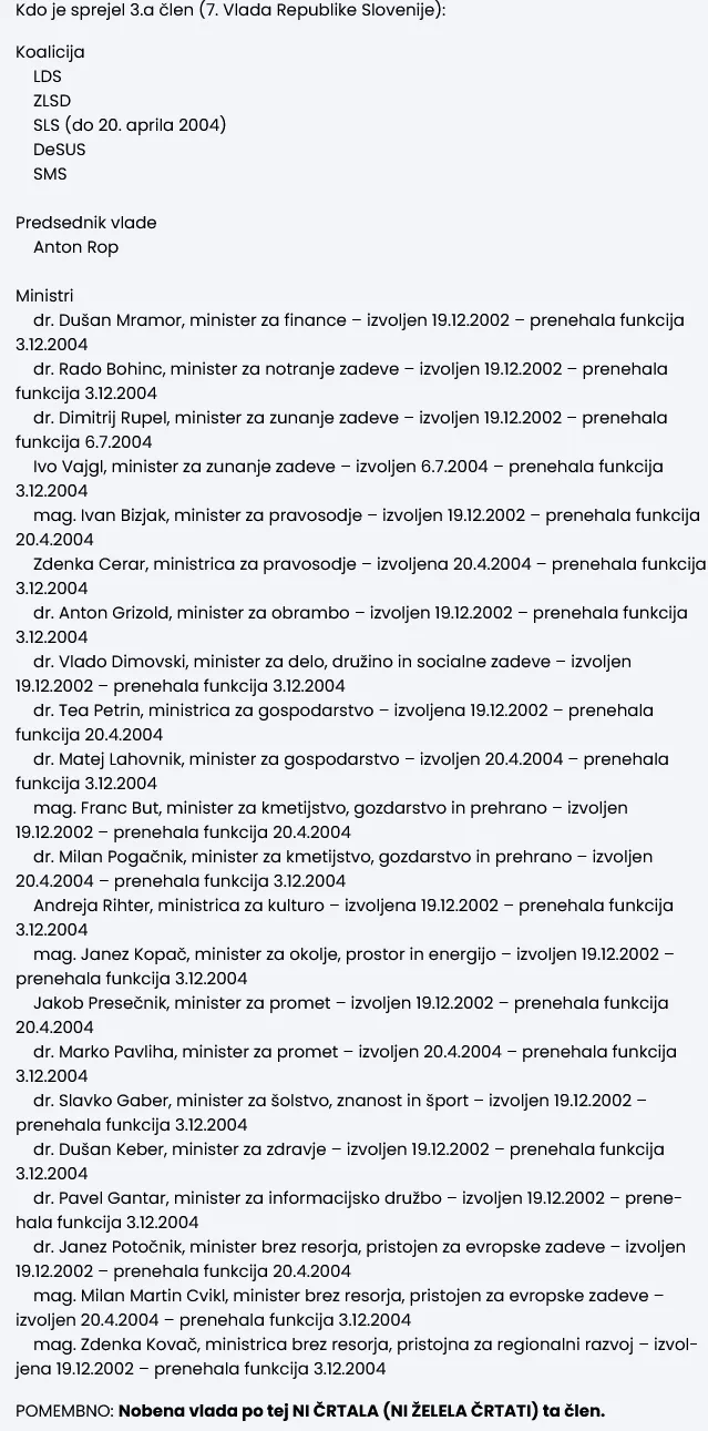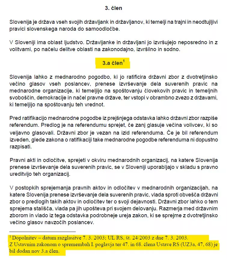 Da ne gremo v daljšo zgodovino (kot je https://trgovinasmrti.si/)dovolj je na primer, da začnemo leta 2003, ko je 7. vlada RS sprejela (po tihem) 3.a člen Ustave (Slovenija lahko z mednarodno pogodbo, ki jo ratificira državni zbor z dvotretjinsko večino glasov vseh poslancev, prenese izvrševanje dela suverenih pravic na mednarodne organizacije, ki temeljijo na spoštovanju človekovih pravic in temeljnih svoboščin, demokracije in načel pravne države, ter vstopi v obrambno zvezo z državami, ki temeljijo na spoštovanju teh vrednot…). Takratna vlada je bila koalicija LDS, ZLSD, SLS (do 20. aprila 2004), DeSUS, SMS - predsednik vlade Anton Rop (glej sliko).