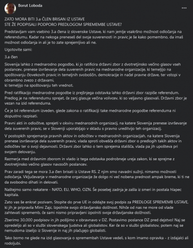 Prav zato, ker je bilo med komentarji, objavami in videi toliko strahu, da bo neka vojska prišla na naše meje in predvsem zaradi poudarjanja dela 3. člena Ustave: “V Sloveniji ima oblast ljudstvo…” sem pripravila povsem novo besedilo predloga sprememb Ustave. Pri tem sem upoštevala vaše zadržke in predloge.