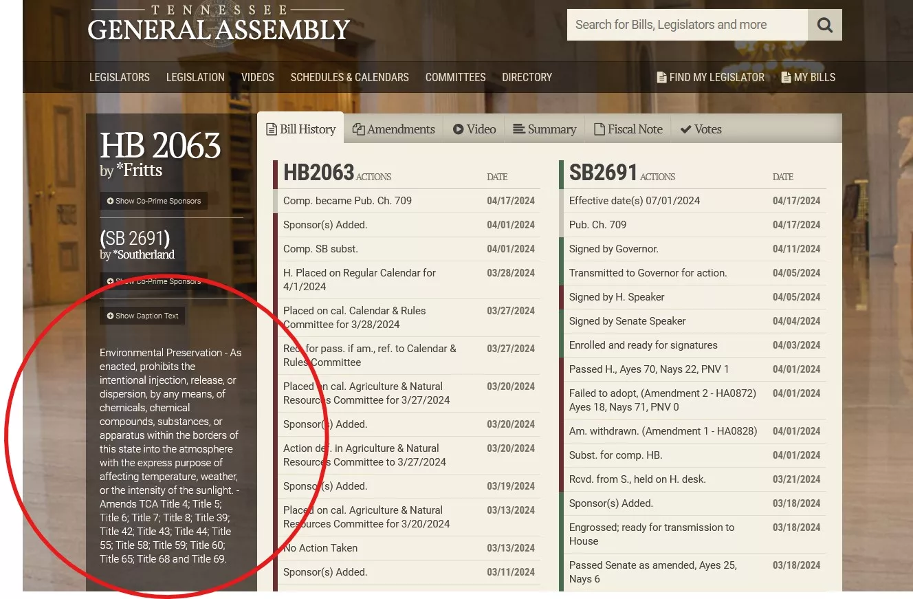 Zakonodajna oblast zvezne države Tennessee je sprejela predlog zakona, ki je usmerjen proti "chemtrailom".