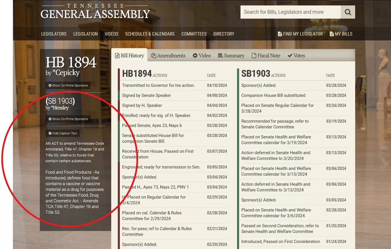 ... V senatu zvezne države Tennessee je bila v četrtek sprejeta prelomna odločitev, saj so zakonodajalci sprejeli predlog zakona HB1894, ki bi v državnem pravnem redu na novo opredelil izraz "zdravilo" in vanj vključil živilske izdelke, ki vsebujejo cepiva ali snovi za cepljenje.