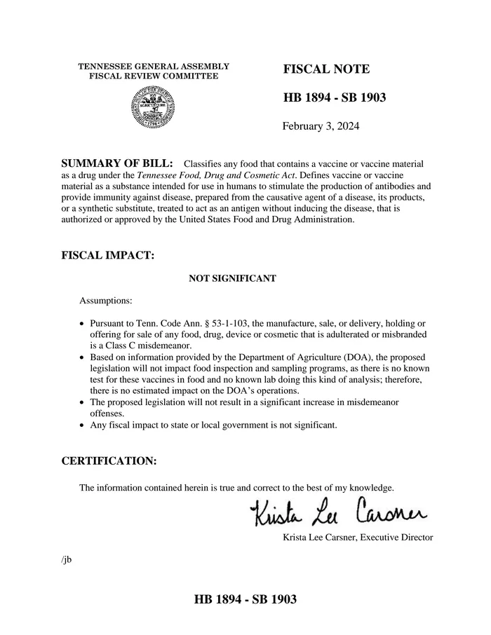 Živila in živilski izdelki - Kot je bilo predstavljeno, opredeljuje živila, ki vsebujejo cepivo ali material za cepivo, kot zdravilo za namene Zakona o živilih, zdravilih in kozmetičnih izdelkih v zvezni državi Tennessee.