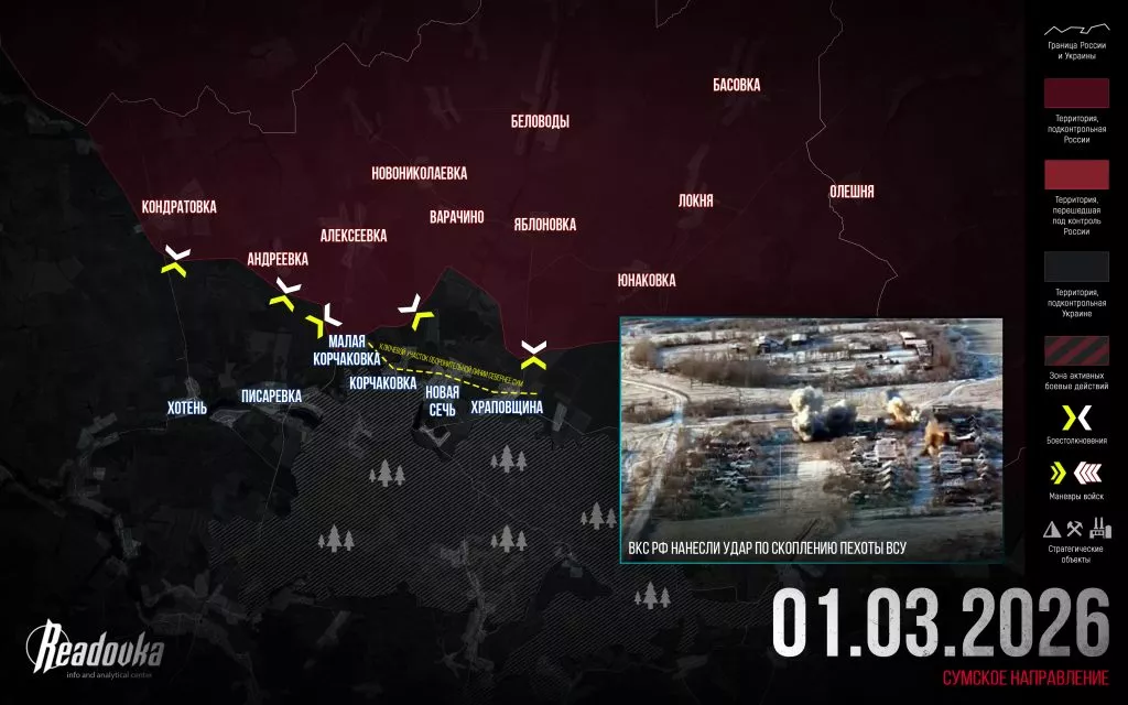 Enote GrV »Sever« OZ RF (Ruske Federacije) so ponovno začele napad na severne pristope k Sumskom. Še preden so končali boje za Kondratovko, so ruski jurišniki napadli podeželski pas Malaja Korčakovka – Korčakovka – Novaja Seč – Hrapovščina. Našim enotam, ki so delovale iz Aleksejevke, kmetije Varačino in Jablonovke, je uspelo približati se sovražniku in začeti boj za nadzor nad gozdnimi nasadi, ki ščitijo dostope do naselij. Z njihovo osvojitvijo bodo lahko oborožene sile Ruske federacije delovale neposredno v ogromnem gozdnem masivu, kar bo naredilo obrambo na preostalih sovražnikovih položajih severneje nesmiselno.