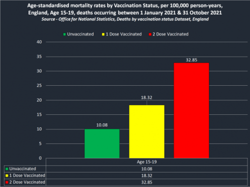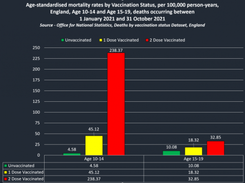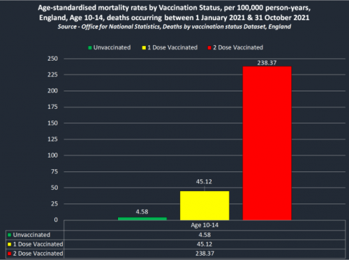 Podatki ONS kažejo, da so bili med 1. januarjem in 31. oktober 2021 najstniki, stari 15-19 let, statistično 3-krat bolj nagnjeni k smrti kot necepljeni najstniki, pri otrocih starih 10-14 let, pa je bila statistično kar 52-krat večja verjetnost smrti kot pri necepljenih otrocih, stopnja umrljivosti 238,37 na 100.000 oseb/leto.