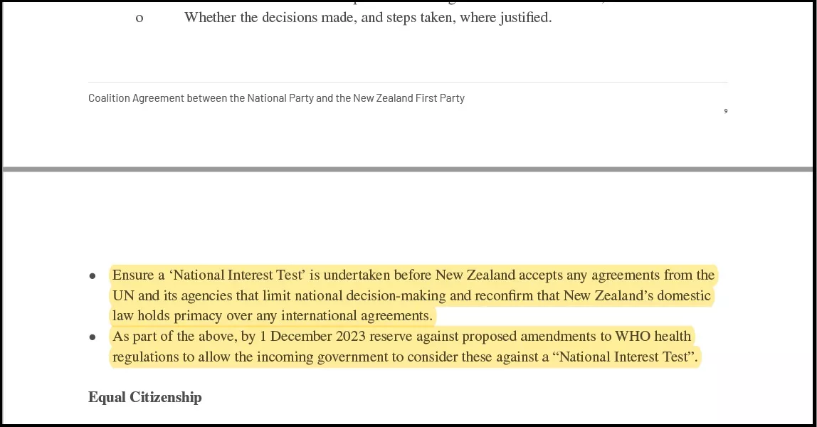 Zagotoviti, da se pred sprejetjem kakršnih koli sporazumov Nove Zelandije z ZN in njenimi agencijami, ki omejujejo nacionalno odločanje, opravi "test nacionalnega interesa" in ponovno potrditi, da ima novozelandska notranja zakonodaja prednost pred vsemi mednarodnimi sporazumi.