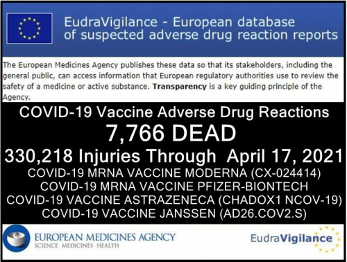 The European database of suspected drug reaction reports, EudraVigilance, is now tracking reports of injuries and deaths following the experimental COVID-19 "vaccines." Their report through April 17, 2021 lists 7,766 deaths and 330,218 injuries following injections of four experimental COVID-19 shots: COVID-19 MRNA VACCINE MODERNA (CX-024414). COVID-19 MRNA VACCINE PFIZER-BIONTECH. COVID-19 VACCINE ASTRAZENECA (CHADOX1 NCOV-19). COVID-19 VACCINE JANSSEN (AD26.COV2.S). This is public information funded by the European Medicines Agency (EMA), and anyone can use the EudraVigilance system and verify this data. Denmark and Norway have completely suspended use of the AstraZeneca experimental COVID-19 shots. A statement issued by the Norwegian Institute of Public Health stated that the AstraZeneca COVID “vaccine” is more dangerous than COVID itself, especially for young people. The EMA continues to recommend it. They did, however, add a safety warning to the J&J shots, due to fatal blood clots.