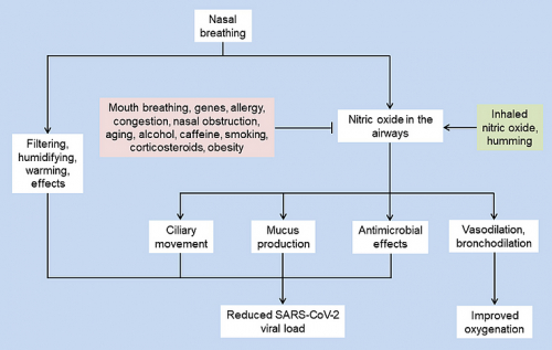 Slika 2. Potencialni učinki nosnega dihanja in dušikovega oksida na SARS-CoV-2 virusno obremenitev in oksigenacijo. Nosno dihanje lahko zmanjša breme virusa in izboljša oksigenacijo pri COVID-19 bolnikih s filtriranjem zraka in povečanjem ravni NO v dihalnih poteh. Več dejavnikov lahko zmanjša ali poveča raven dušikovega oksida, kar kažejo roza oz. zeleni pravokotniki. (Martel, 2020)