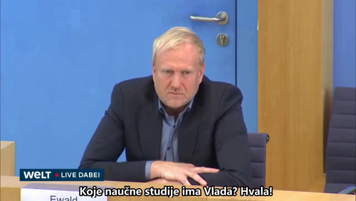 Na tiskovni konferenci 9. aprila letos je nemški novinar (Boris Reitschuster) tiskovnemu predstavniku nemškega ministrstva za zdravje (Oliver Ewald) zastavil zelo zanimivo in relevantno vprašanje o zaklepanju in njegovi učinkovitosti v boju proti kroni, na katerega je Ewald, ves presenečen., Z veliko dozo nevednosti zavestno daje neustrezen odgovor, ki ne vpliva na bistvo zastavljenega vprašanja. Boris Reitschuster, znan po svoji neizprosnosti in nerodnih vprašanjih, je sicer nemški vladi kot trn v peti na tiskovnih konferencah, saj jih vsakič spravlja v težave ...