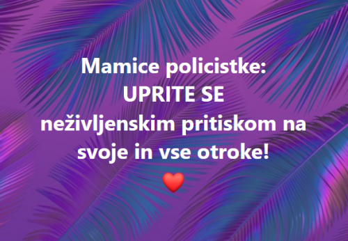 Starši, ali želite, da vam otroka ustrahujejo in neprestano vršijo pritisk nad svobodnim obnašanjem katerega tvoj otrok tako pogreša in mu to prepovedujejo?! Želite, da vam otroka, ki še niti ni začel živeti, prevzgojijo v novodobnega robota? Ste že poskusili govorit 45min z masko na sebi? Kosilo bodo jedli časovno omejeni na 15 min... Masko odstranijo, ko se usedejo in jo nataknejo v istem trenutku, ko prenehajo jesti ... Halo? Zato, da boste imeli dopoldan ''mir'' in počitek pred svojim otrokom? V to ustanovo, preimenovano v "novodobno šolo" želite vrnit svoje ljubljeno bitje?"