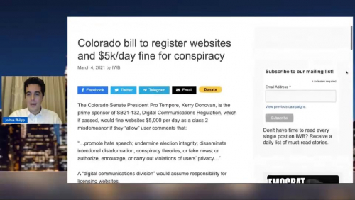 "... Zakon ustvarja digitalno komunikacijsko divizijo (Oddelek) in digitalno komunikacijsko komisijo (Komisija) v okviru Oddelka za regulativne agencije. Na letni ravni in za razumno pristojbino, ki jo določi Komisija, bo oddelek registriral digitalne komunikacijske platforme, ki so določena komunikacijsko usmerjena spletna podjetja, kot so družabne medijske platforme ali platforme za izmenjavo medijev, ki opravljajo poslovanje v Koloradu ali Storitve, ki se ponujajo prebivalcem Kolorada. Digitalna komunikacijska platforma, ki se ne registrira čez oddelek stori prekršek razreda 2, in se kaznuje z globo do 5.000 dolarjev za vsak dan kršitve.