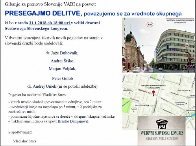 31.1.2018 je bil v veliki dvorani Svetovnega Slovenskega kongresa posvet: "PRESEGAJMO DELITVE, povezujemo se za vrednote skupnega", na katerem so sodelovali: