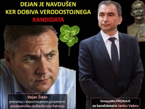 Končno dobivamo relevantnega kandidata. Obeta se spopad med podpredsednikom, SD in njegovim predsednikom Dejanom Židanom, ki vztraja pri podpori za predsedniško funkcijo povsem nezainteresiranemu (beri indolentno nesposobnemu) Borutu Pahorju, ki si službe sicer želi, samo ne ve kaj bi z njo počel. Toda o tej novici naši MEDIJI kot rečeno (še) MOLČIJO, saj imajo pomembnejše teme npr. sprejem škodljive Arbitraže, »fazaniranje« dijakov, Najbližji zasledovalec aktualnega predsednika države ostaja kamniški župan Marjan Šarec, ki je kot veste mlad KOMIK v občini z največ črnimi gradnjami v Sloveniji…