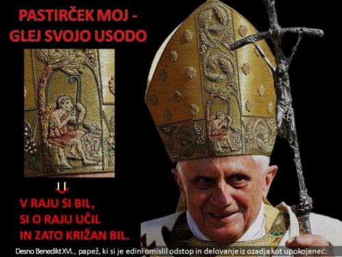 Pastirska palica papeža Benedikta XVI. in upodobitev pastirčka na njegovi vladarski Mitri.